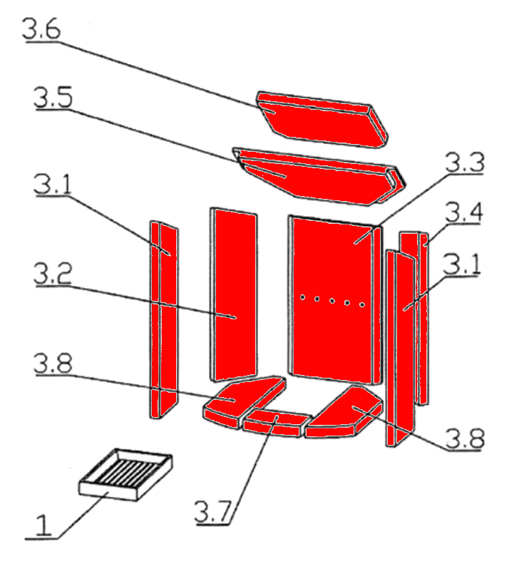 - L'expérience a montré que cette brique de foyer était installée dans la chambre de combustion, dont les caractéristiques frappantes sont la brique avant (152 x 95 x 30 mm) et la brique latérale à l'avant gauche (121 x 455/520 x 25 mm).