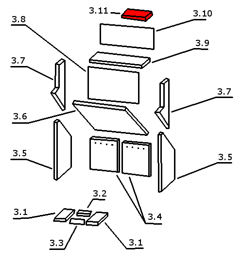 - L'expérience a montré que cette plaque s'intègre dans la chambre de combustion avec les caractéristiques suivantes : paroi arrière d'une seule pièce, bloc inférieur à gauche (118 x 276 mm), revêtement chambre de combustion semi-circulaire en haut (400 x 250 mm)